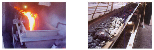 耐熱輸送帶主要用于輸送高溫物料,如燒結(jié)礦、熱焦炭、水泥熟料、熱鑄件等。根據(jù)耐熱帶破損以至喪失輸送能力的主要表現(xiàn)和不同的耐熱級別,分別采用三元乙丙或丁苯橡膠做覆蓋膠;高強高滲透聚酯帆布或棉帆布做強力層。覆蓋膠與骨架層間可輔設(shè)耐熱玻璃布,以提高耐熱帶使用壽命。根據(jù)用戶要求,可做成環(huán)型帶。